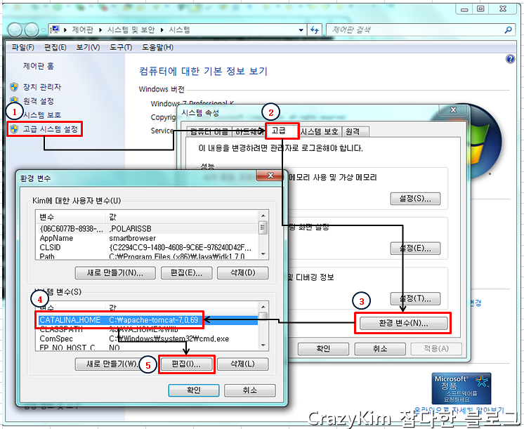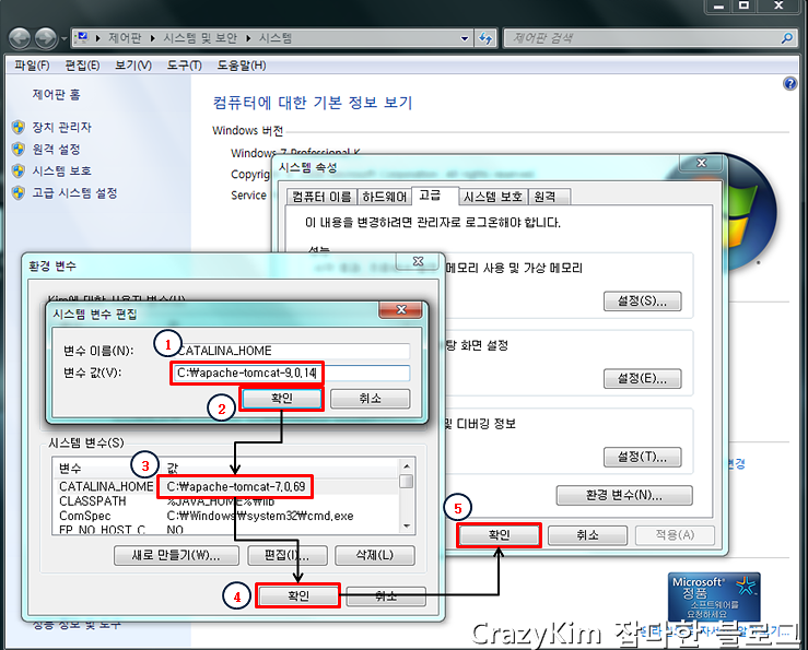 1. 시스템 변수 편집창에서 CATALINA_HOME의 변수 값을 변경하려는 톰캣서버의 경로를 입력합니다