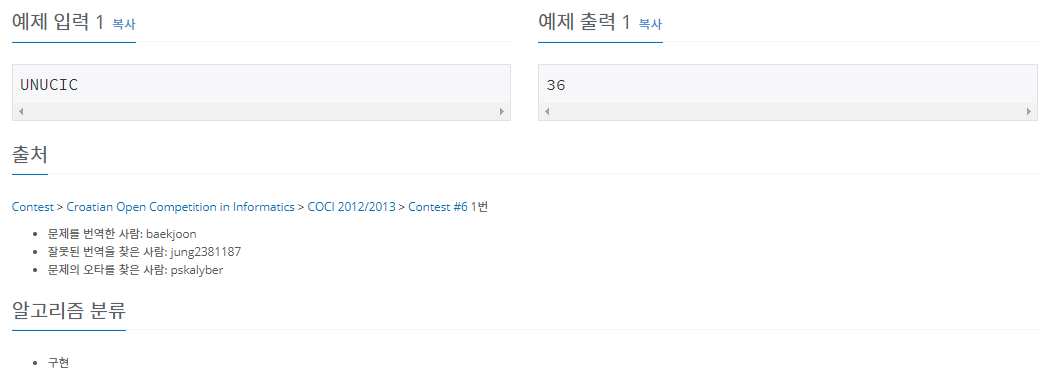 첫째 줄에 알파벳 대문자로 이루어진 단어가 주어진다. 단어의 길이는 2보다 크거나 같고, 15보다 작거나 같다.