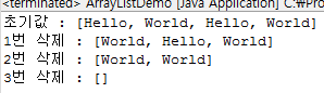 2. al.remove(1) 두 번째 데이터 "Hello"가 삭제되어 [World, World]가 출력됩니다