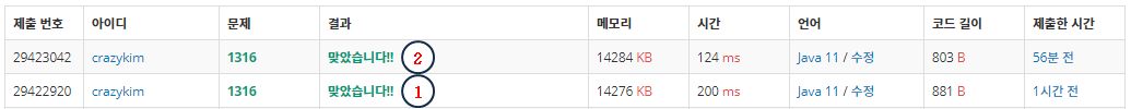 첫 번째 제출한 정답은 많이 다듬지 않아서 시간이 많이 든 것을 볼 수 있습니다