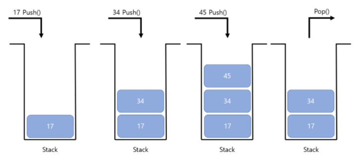 다른 배열들과는 다르게 LIFO 방식을 사용하므로 도중에 데이터를 삽입하는 것이 불가능합니다