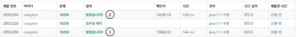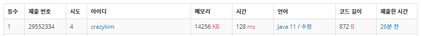 다듬었더니 백준알고리즘 자바부분에서 메모리/속도 1등이 나왔네요 ㅎ 굳굳