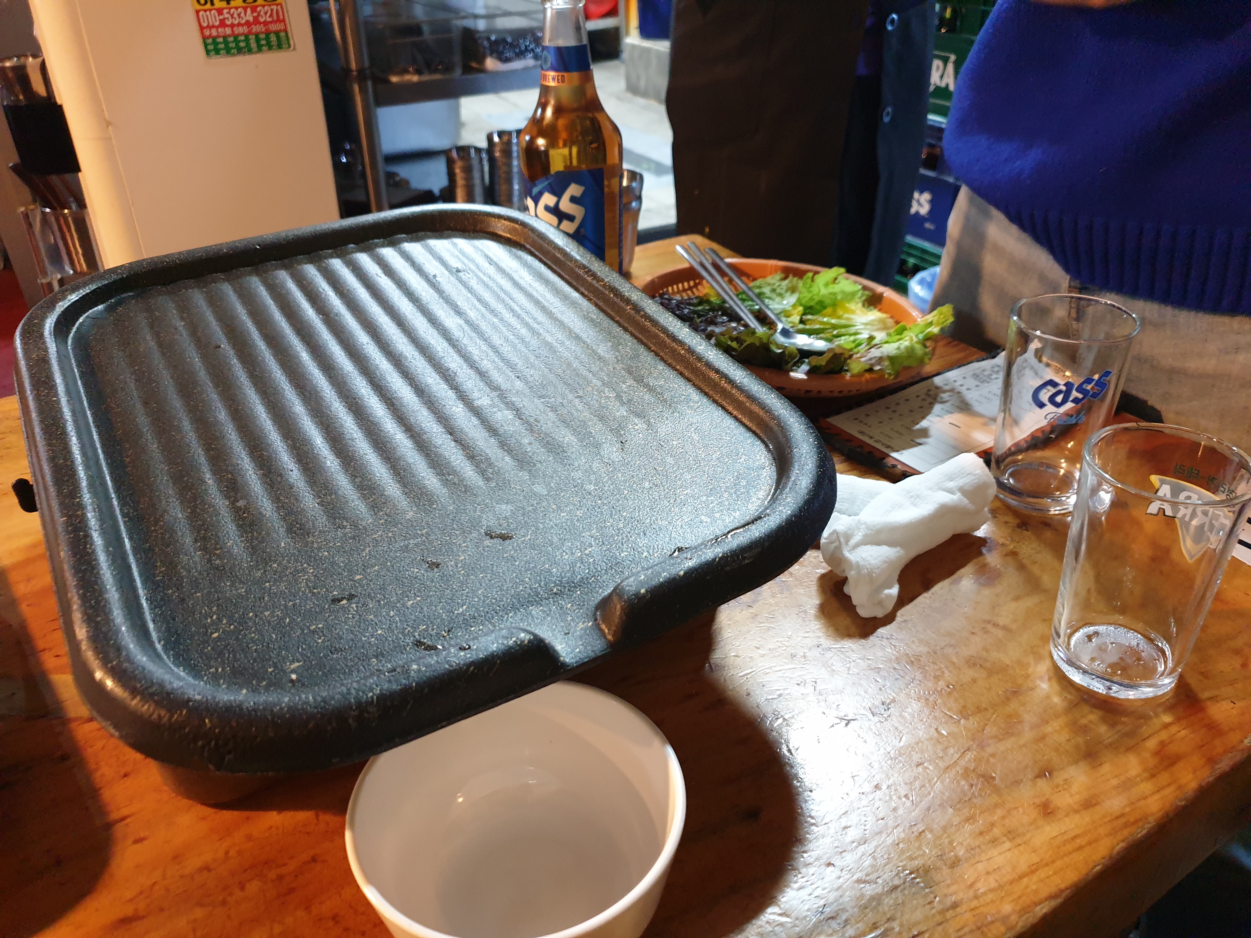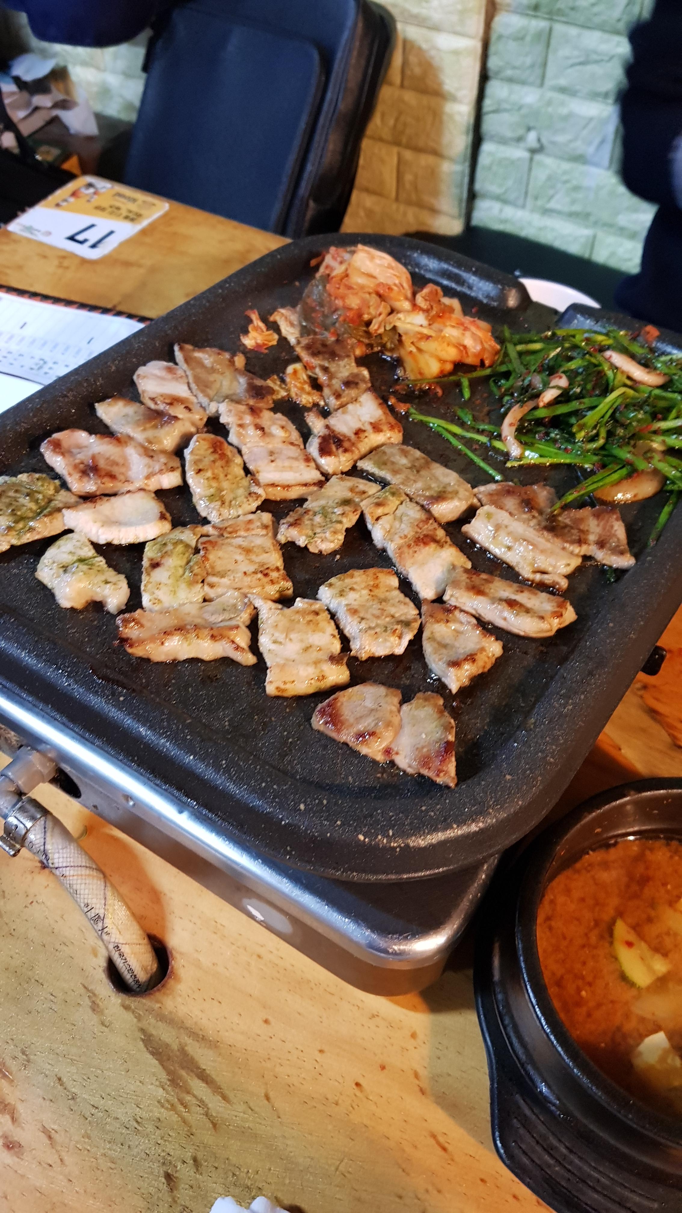 고기판에 고기를 올리고 이어서 부추, 김치를 올려서 먹으니 존맛이었습니다