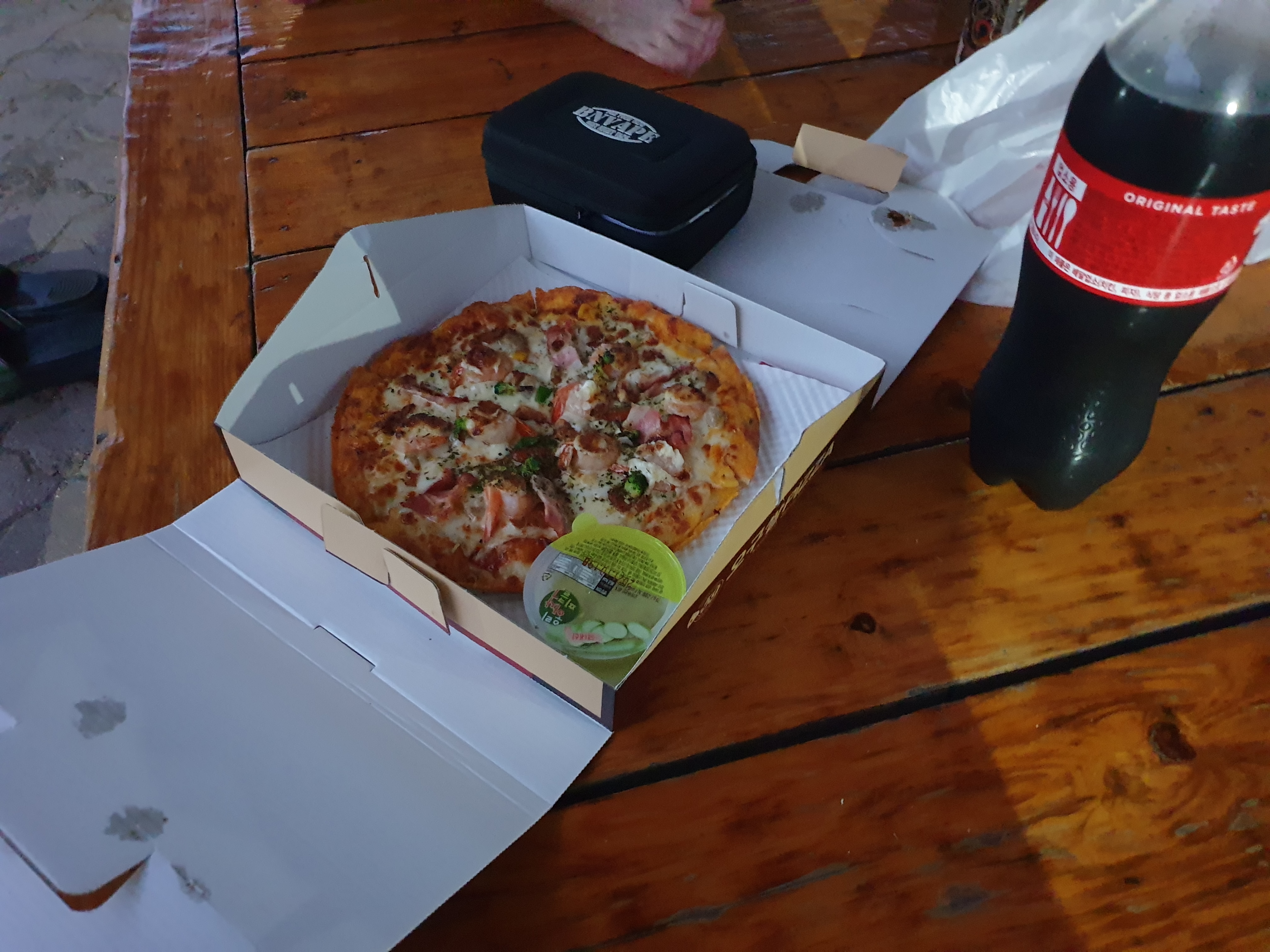음식점 대신에 밖에서 피자를 먹었습니다