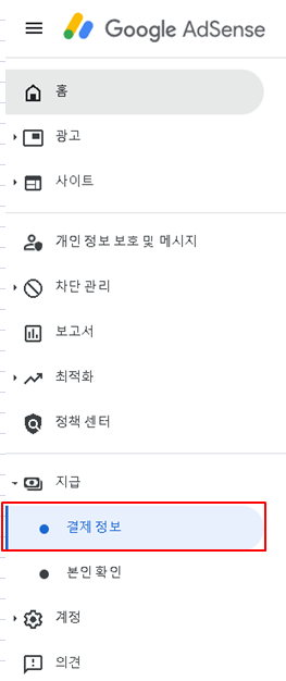 다른 방법으로는 좌측 메뉴의 "지급"탭의 "결제 정보"메뉴를 선택하면 결제 정보 페이지로 이동할 수 있습니다.