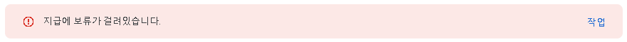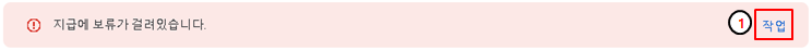 계좌를 등록하기 위해 결제 정보 페이지로 이동을 해야합니다. 첫 번째 방법은 "지급에 보류가 걸려있습니다." 경고 메시지의 우측을 확인하면 "작업"버튼이 있습니다. "작업"버튼을 클릭하여 이동합니다.