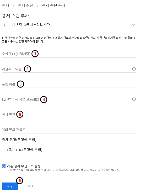 결제 수단 추가 페이지에서 "새 은행 송금 세부정보 추가"를 선택하면 아래 이미지같은 페이지가 스크롤됩니다. 차례대로 정보를 입력합니다.