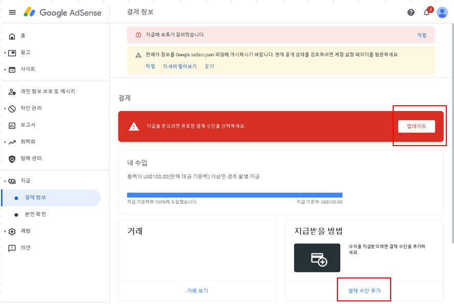 결제 정보 페이지를 보면 빨갛게 "지급을 받으려면 유효간 결제 수단을 선택하세요."라는 메시지가 떠 있습니다. ㄷㄷ;; 우측의 "업데이트"버튼을 선택 또는 "지급받을 방법"탭의 "결제 수단 추가"버튼을 선택하여 결제 수단 추가 페이지로 이동합니다.