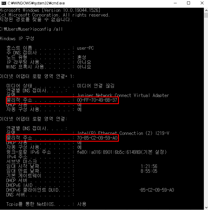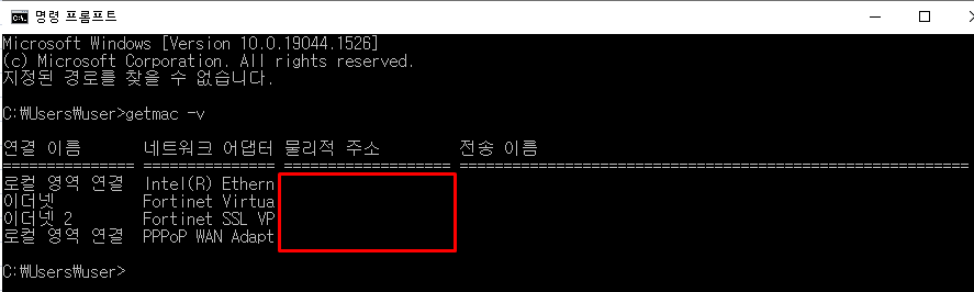 "getmac -v" 명령어를 입력하여 맥 주소를 확인할 수 있습니다.
