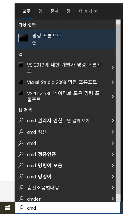 하단의 시작 검색 창에 "cmd"를 입력하여 들어갑니다.