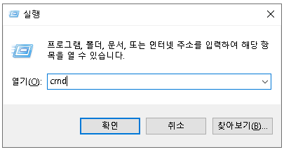 Window키 + R 키를 눌러 실행창을 띄운 후 "cmd"를 입력합니다.