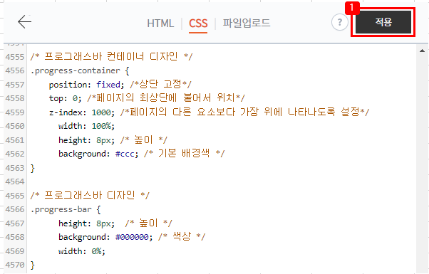 마지막으로 프로그래스바의 디자인을 해줍니다. 아래의 코드를 복사하여 "CSS"탭의 아무대나 붙여넣어줍니다.