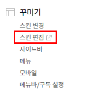 블로그 관리자 페이지로 이동하여 좌측의 메뉴에서 "꾸미기" - "스킨 편집"으로 들어갑니다.