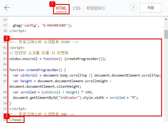 프로그래스바 영역을 만들었으니 프로그래스바가 동작하도록 이벤트를 만들겠습니다. "HTML"탭의 <head></head>사이에 프로그래스바 스크립트를 추가해줍니다. 아래 코드를 복사하여 추가해줍니다.