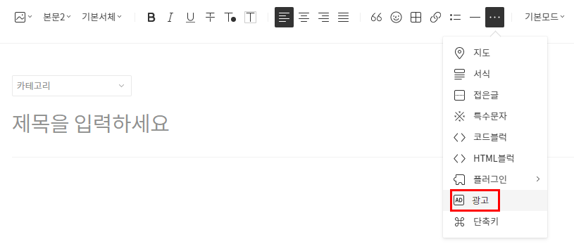 글쓰기 에디터 창으로 이동하여 "···"을 선택합니다. 하단의 "광고"메뉴를 선택하여 삽입합니다.