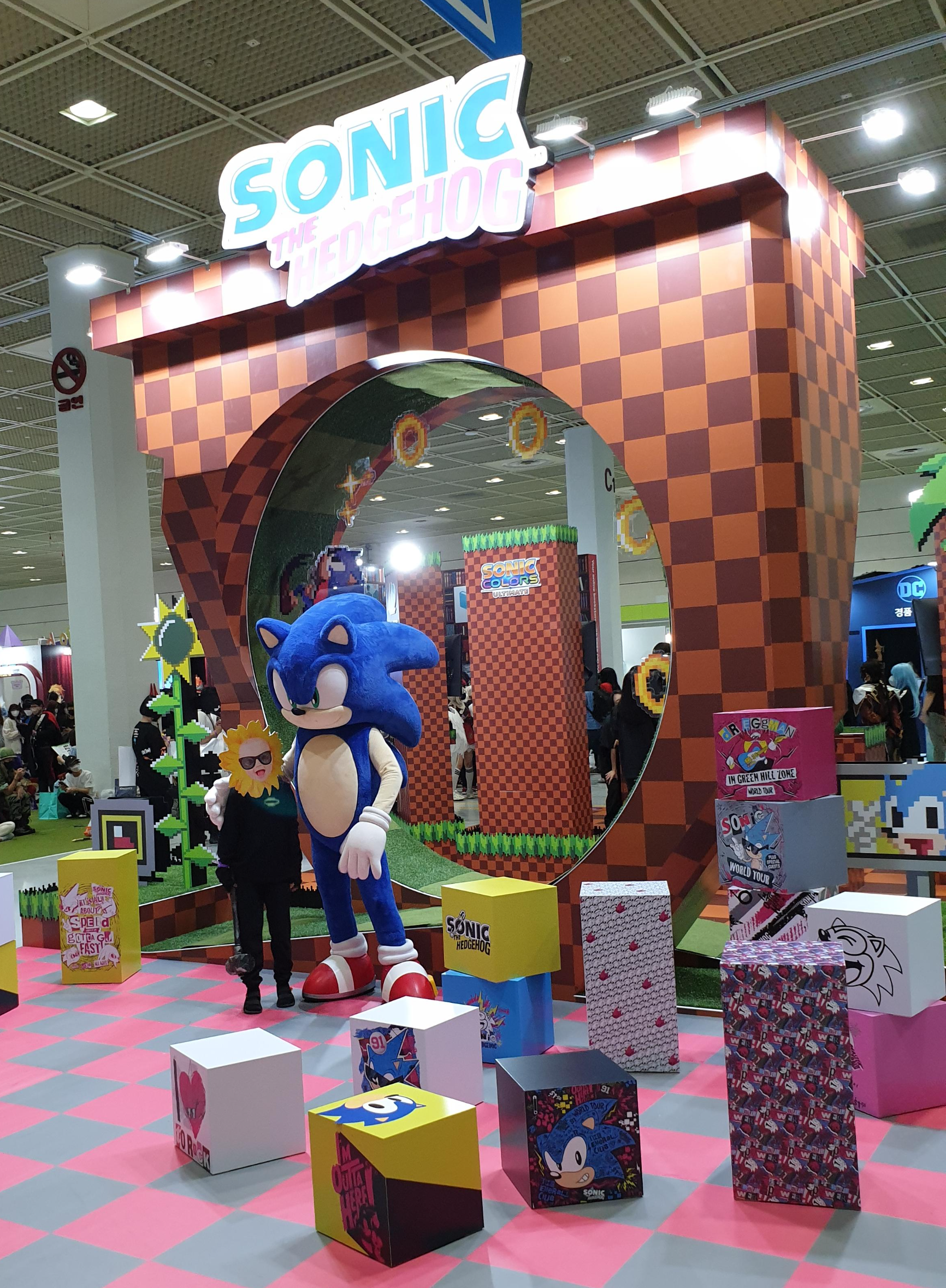 입구에 입장하니 세가의 소닉부스가 있어 소닉과 함께 사진을 찍을 수 있었습니다. ㅋㅋ 다양한 코스프레를 하신 분들이 사진을 찍고 계셨어요. 그 와중에 애기가 태양머리를 하고 같이 사진을 찍고 있길래 옆에서 사진 한장...