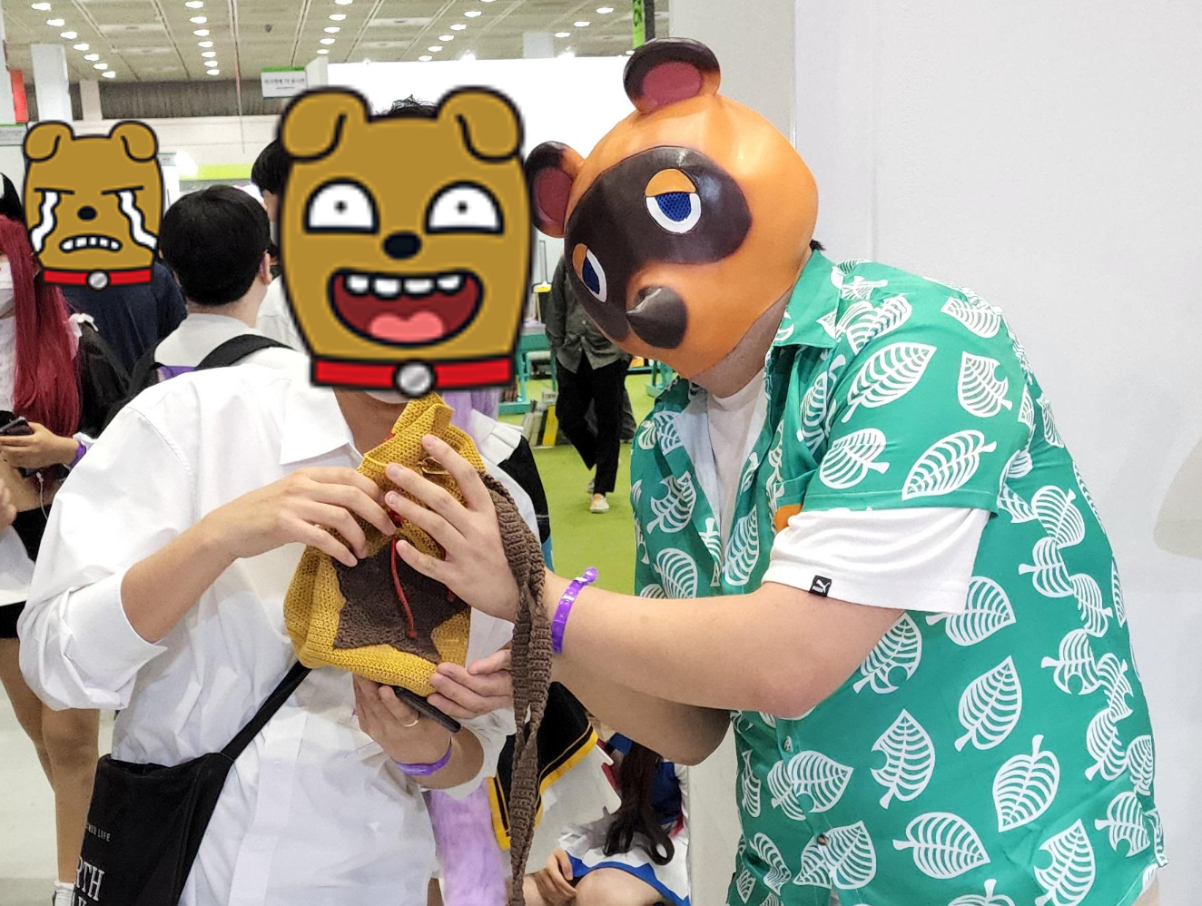 동물의 숲도 정말 재밌게 했던 게임 중 하나인데 동물의 숲의 촌장님 코스프레를 하신 분도 계셔서 같이 사진 한 장! 사진을 찍으니 보다리에서 초콜릿을 나눠주셨어요... 잘 먹었습니다. 다른 코스프레하신 분들이랑도 사진을 몇 개 찍었지만 얼굴이 보이셔서 함부로 올리기가 그렇네요ㅠ