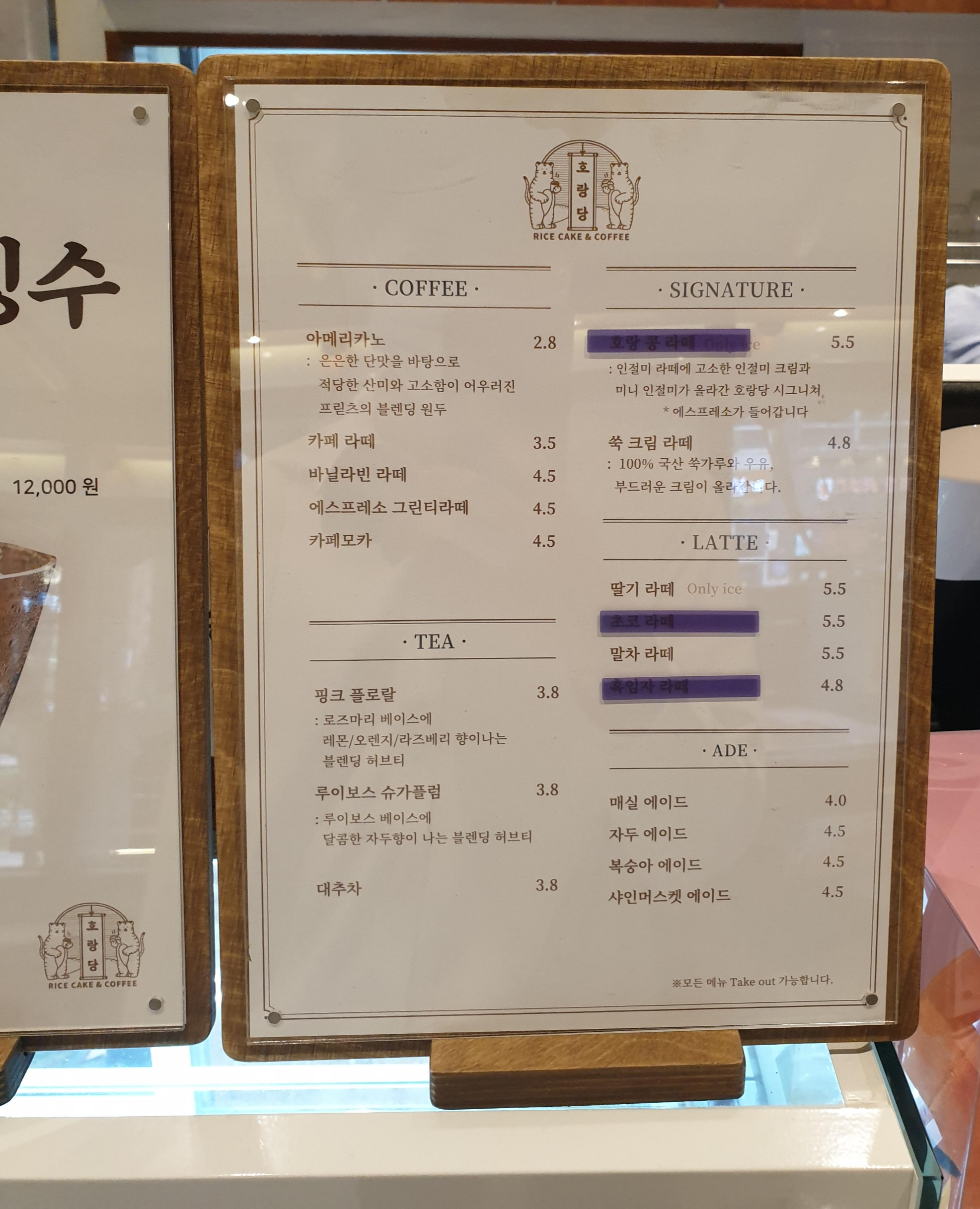 시그니처메뉴인 쑥크림라떼와 인절미, 약밥 그리고 하나는 사과향이 나는 떡이었는데 이름이 기억이 나지않는다ㅠㅜ