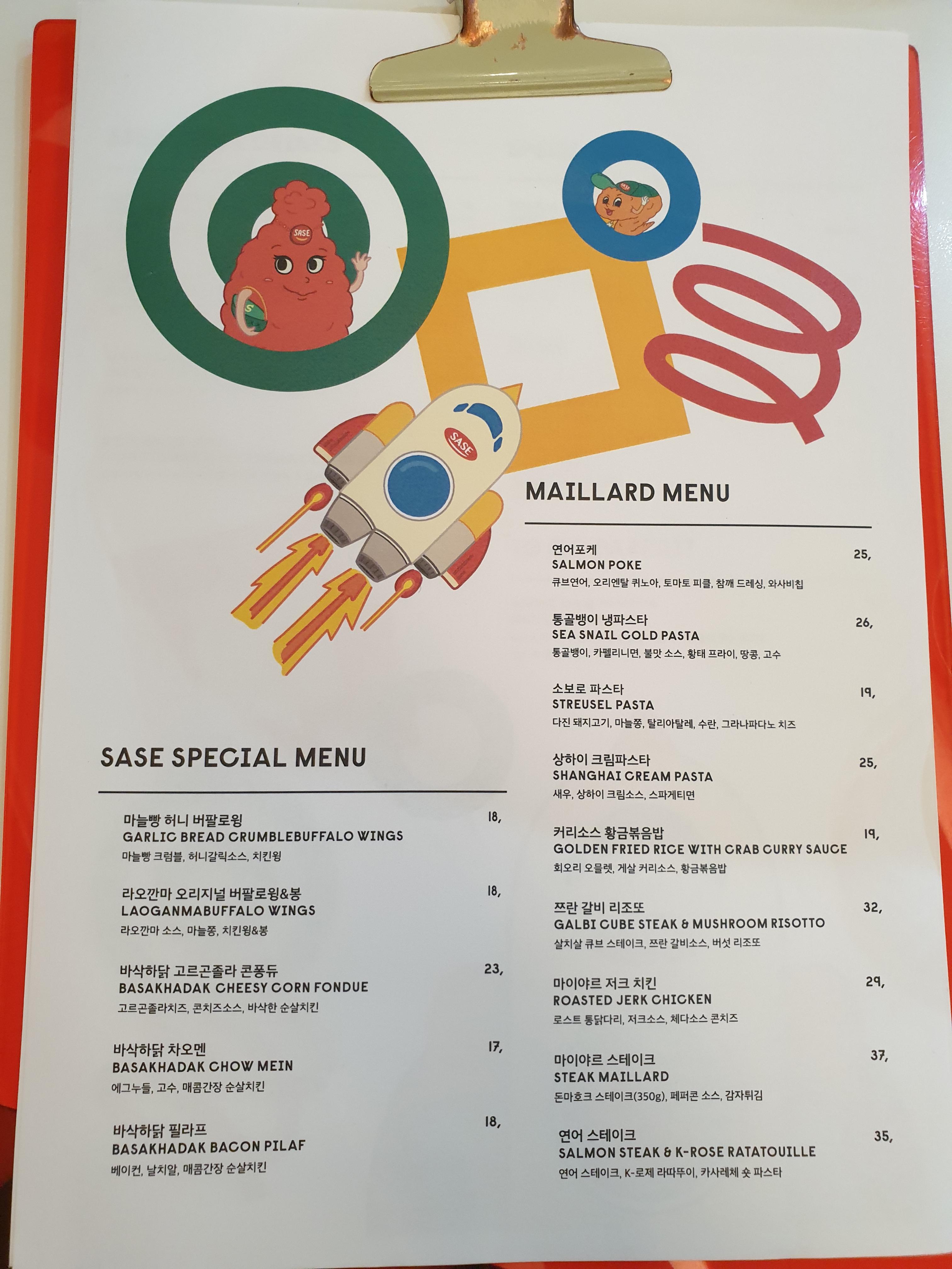 이어서 콜라보와 맞게 메뉴판도 꾸며져 있었습니다. 아무래도 자주 올 것이 아니기때문에 SASE SPECIAL MENU는 넘어가고... 주로 많이 먹는 연어포케, 통골뱅이 냉파스타, 마이야르 스테이크 3개+음료로 오딸바 크리스탈 에이드를 주문했습니다.