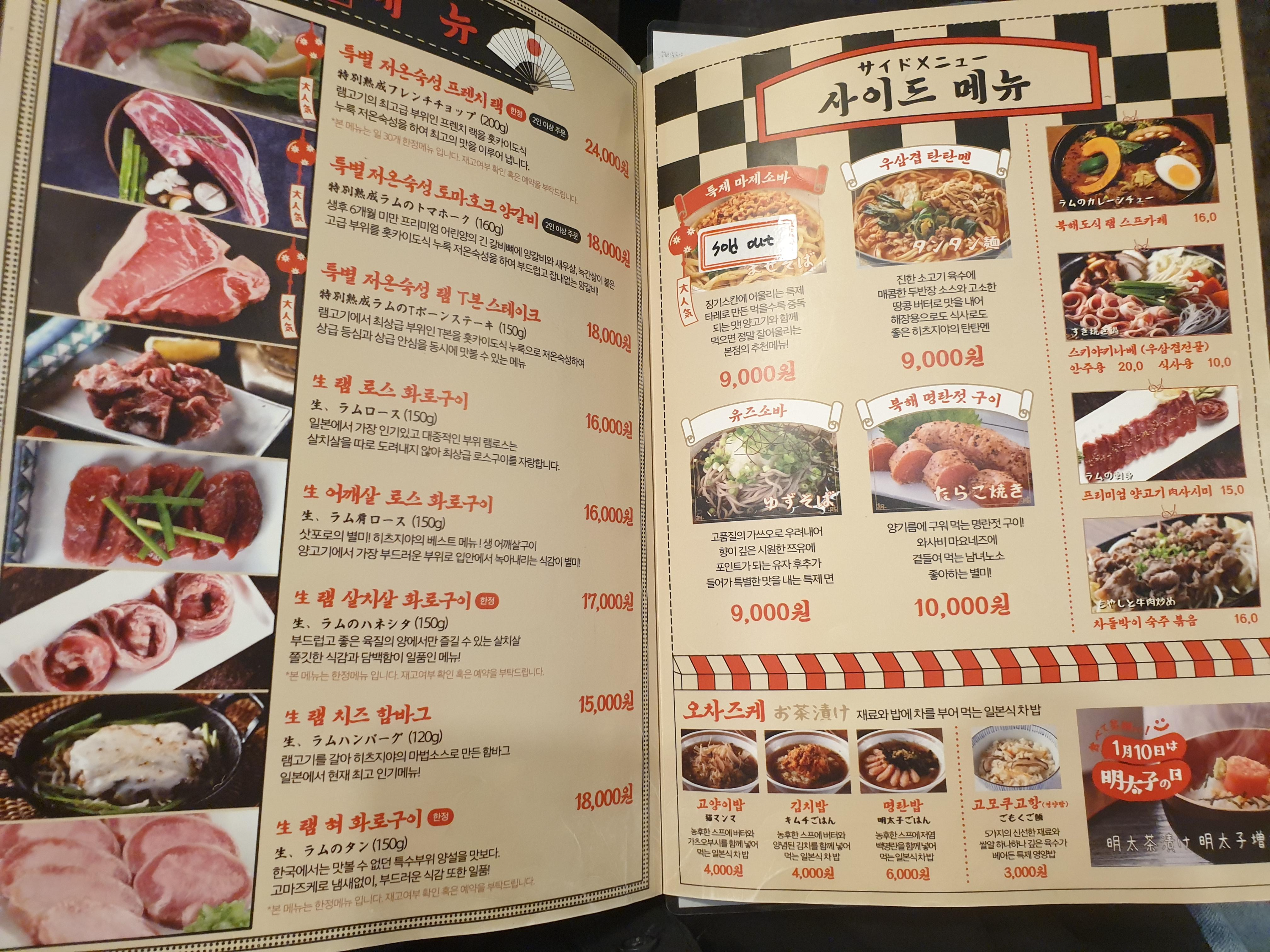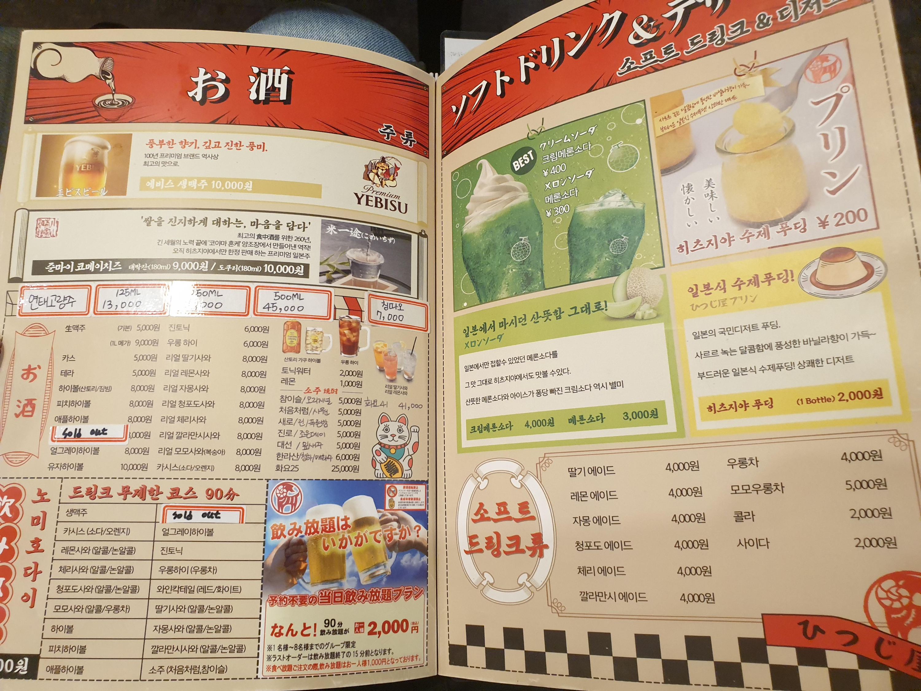 히츠지야 메뉴판입니다. 저희는 남자 3명에서 1인당 42000원 타베호다이코스(양고기무한리필)을 먹었습니다. 추가로 청포도 에이드, 에비스 생맥주 2잔을 시켰습니다. ㅎㅎ
