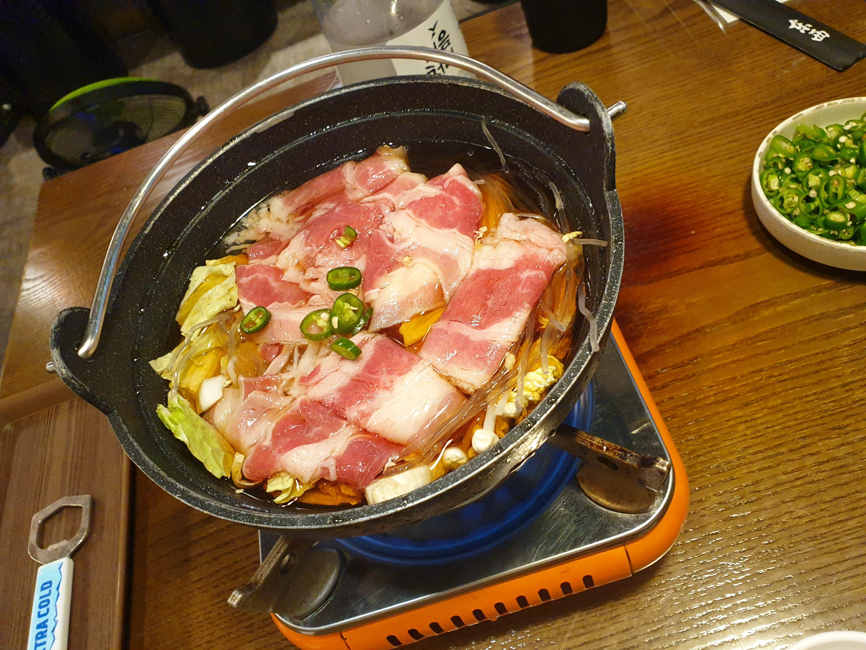 고기가 나오기 전에 서비스 나베를 주셔서 국물을 한 모금 마셨는데 너무 맛 있었습니다. 국물 맛이 미묘하게 단짠단짠이라 맛 있었어요. 참고로 나베도 리필이 가능합니다.