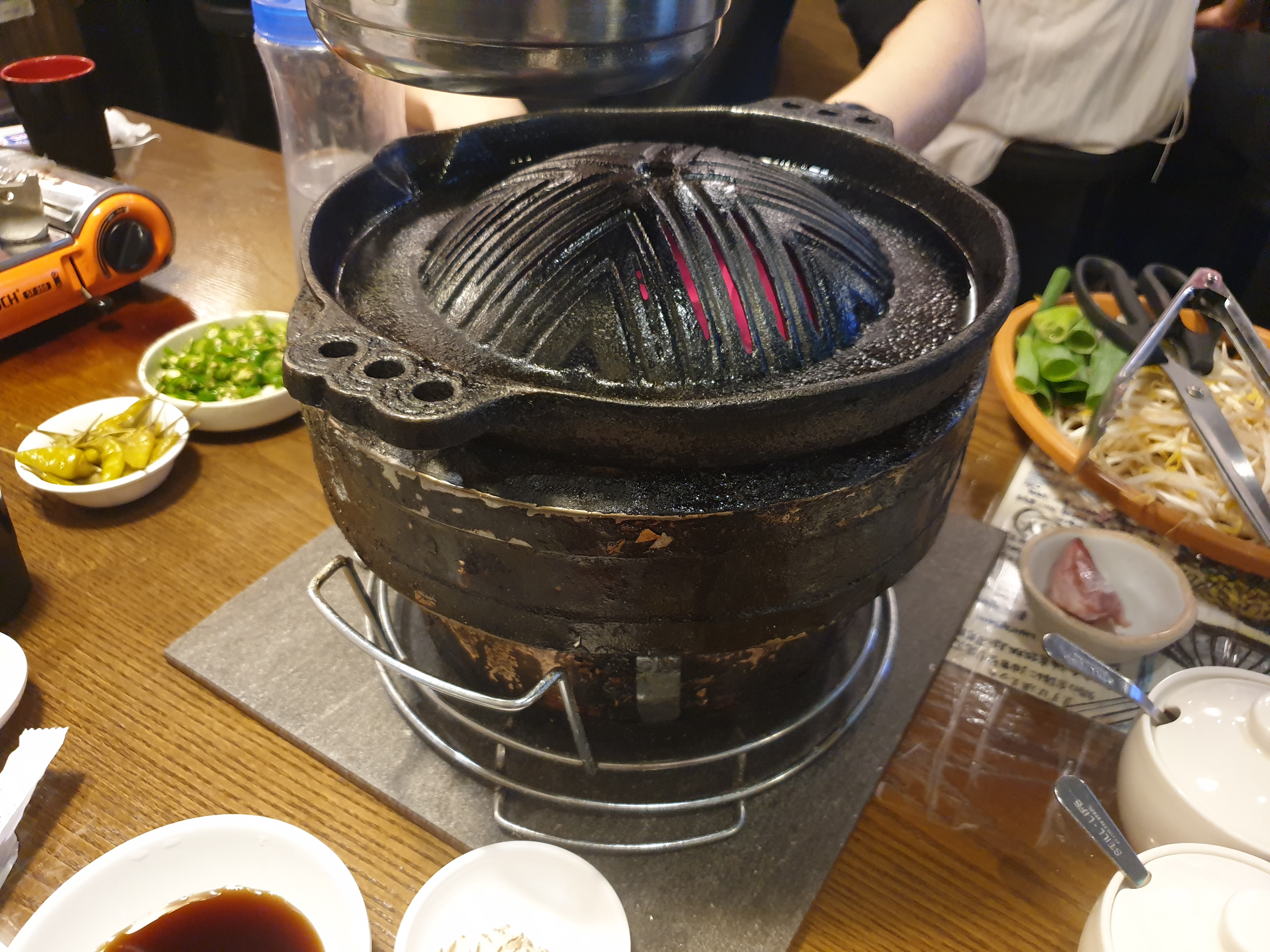 다른 테이블을 보는데 저희 테이블만 철판이 특이하게 생겨 물어봤는데 이 철판이 고기를 굽기가 힘들어서 다른 판으로 교체했다고 해요.