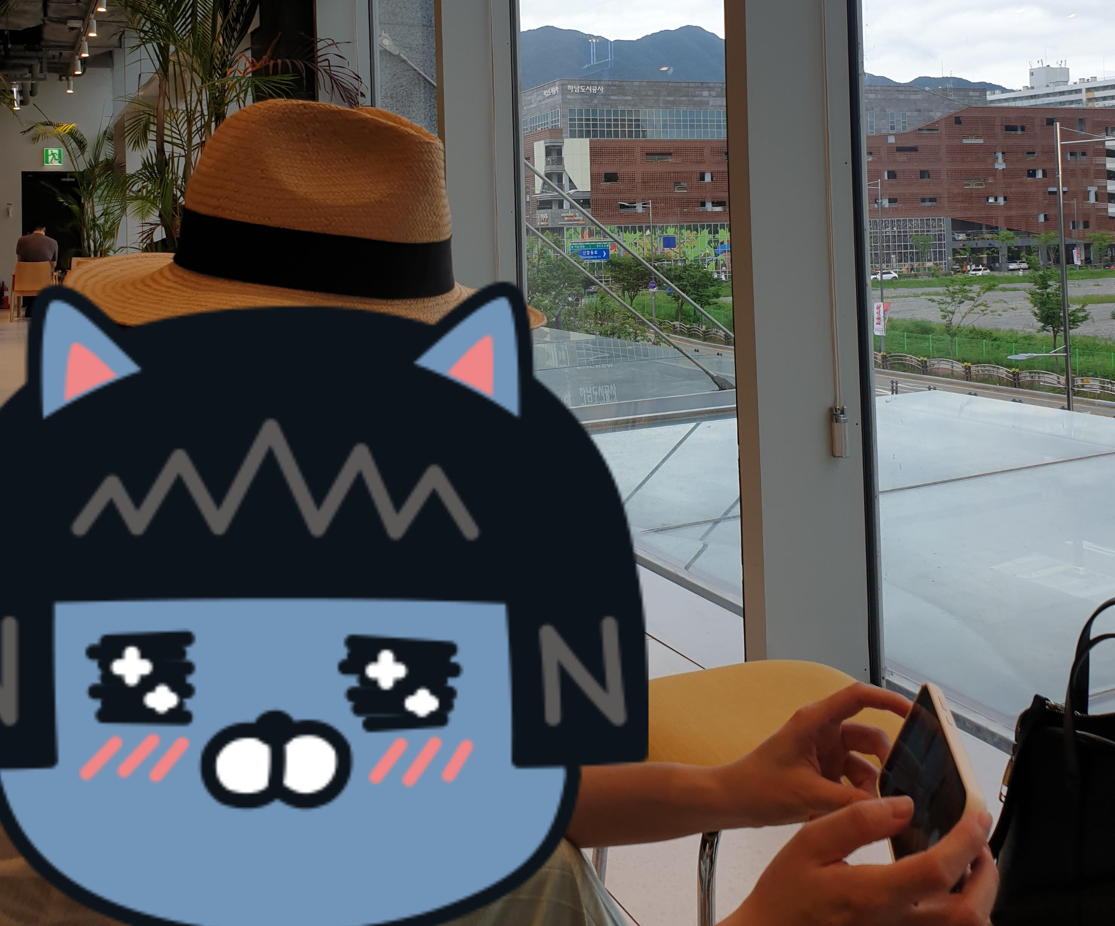 벽에 페도라가 걸려있어서 기분도 낼겸 페도라를 쓰고서 커피를 마셨습니다. ㅎㅎ