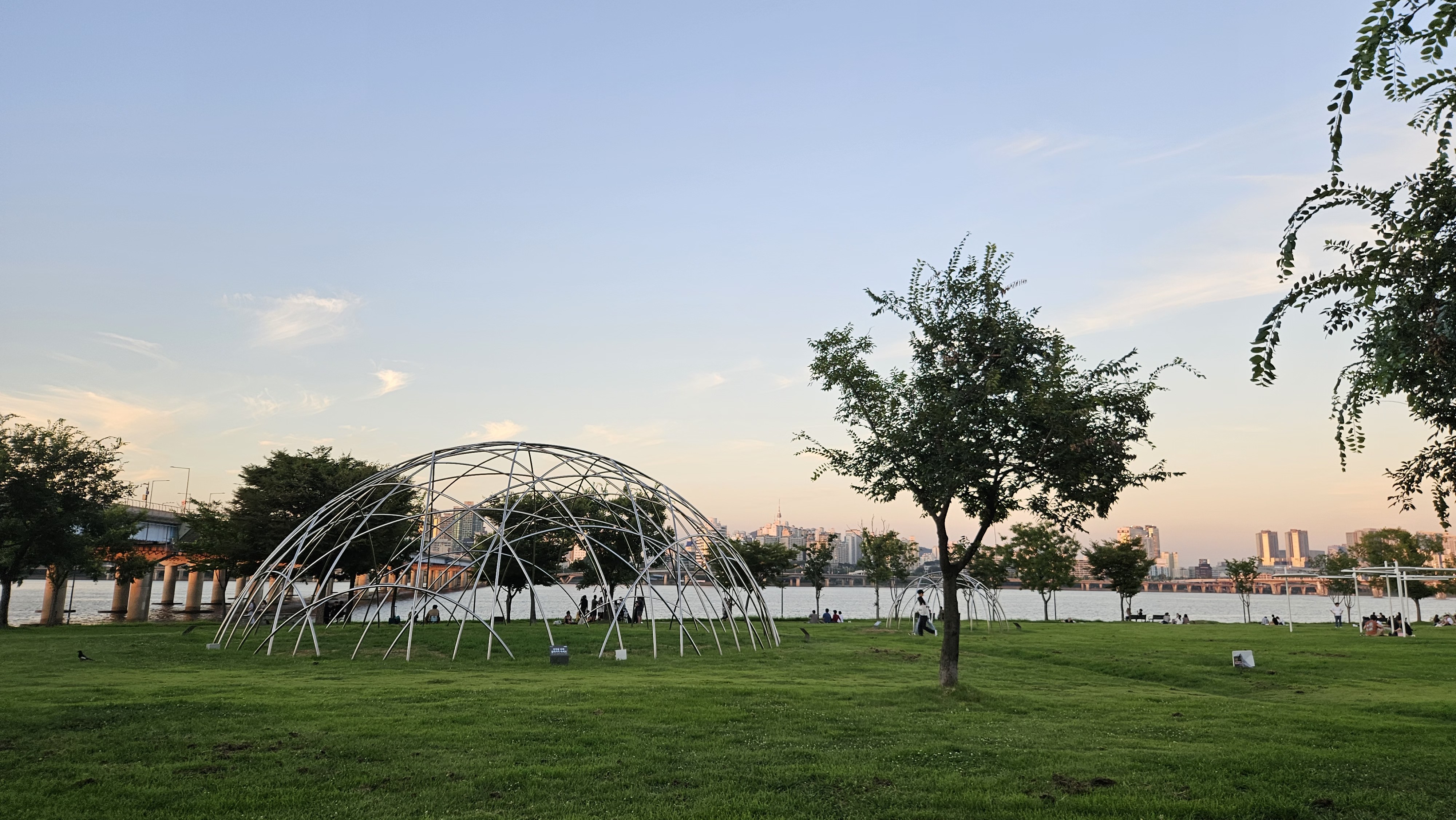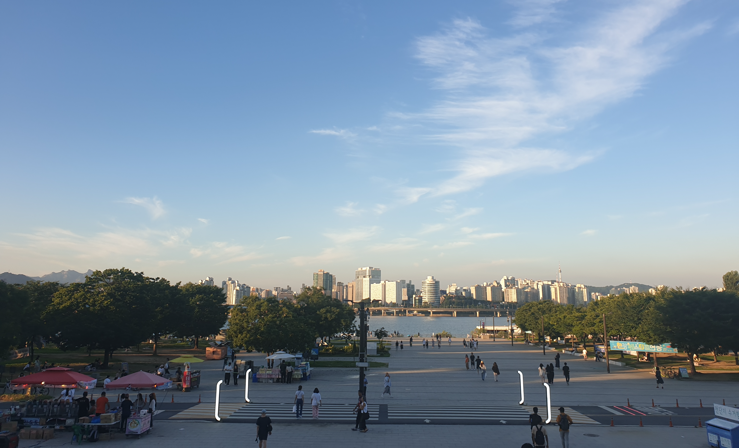 여의나루역 2번 출구를 내려 한강을 보는데 하늘이 너무 예뻐서 사진을 안 찍을 수 없었습니다. ㅎㅎ 도착하자마자 계단 위에서 사진 한 장 찍었습니다. 금요일 저녁이었는데 다들 한가로이 산책하는 모습들도 너무 좋았습니다.