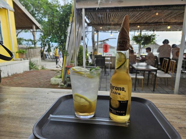 안 쪽에 바다가 보이는 곳에서 자리를 잡고 여친은 술이 끌린다고 하여 코로나를 마셨습니다. 헤헿