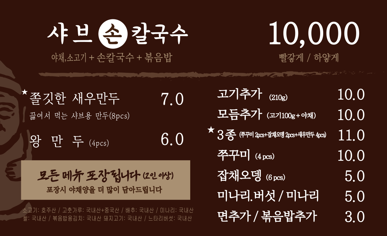 야채, 소고기, 손칼국수, 볶음밥까지 포함해서 만원입니다. 빨갛게와 하얗게가 있는데 빨갛게도 그렇게 맵지 않아서 빨갛게를 추천드립니다. ㅎㅎ