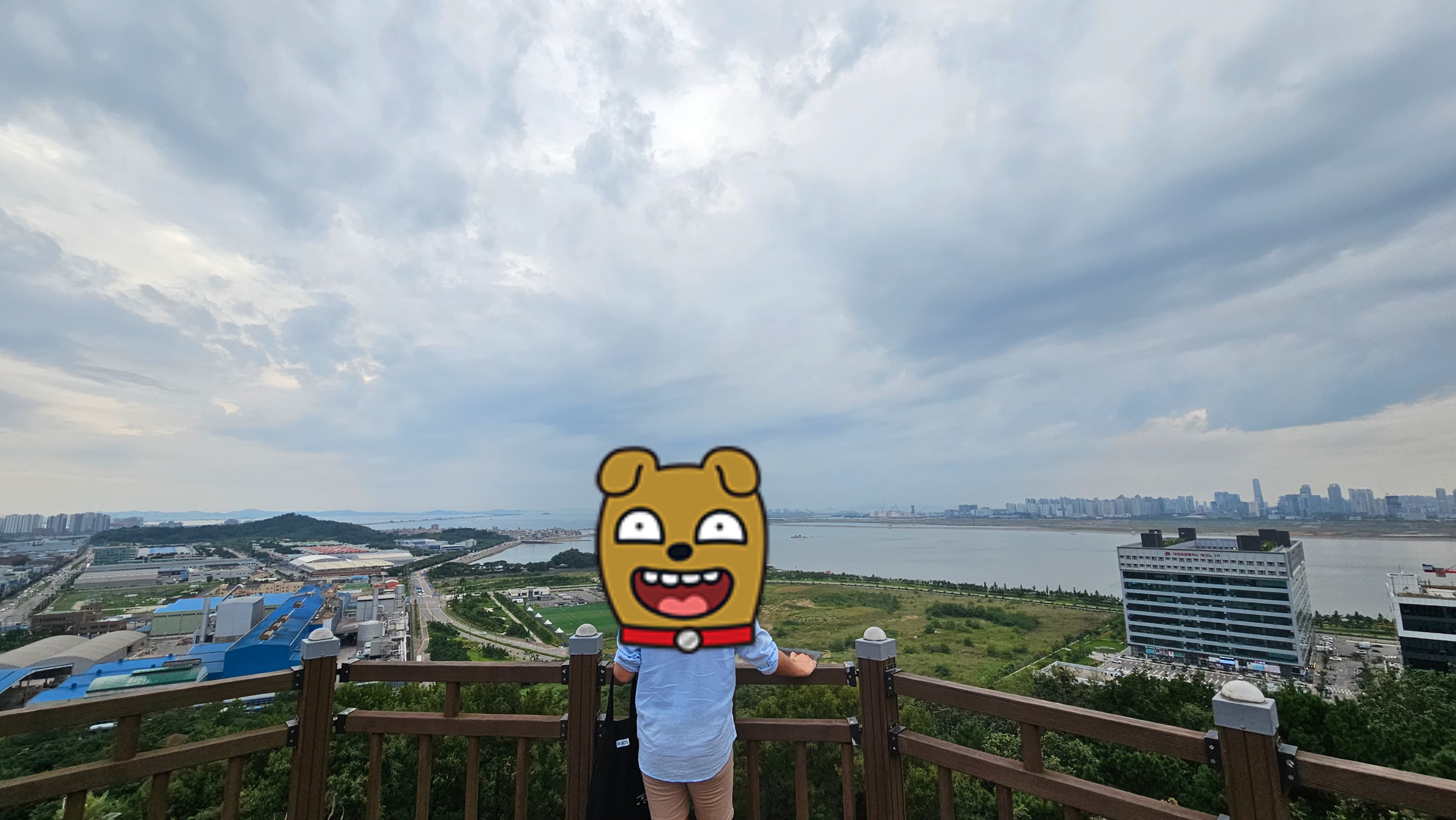 정상 도착!! 사진은 못 찍었지만 정상에 도착할쯔음 되면 정자가 보이기 시작합니다. 정자에서 조금만 더 가면 포트스팟이 나옵니다. 포토스팟에서 사진 몇 장을 찍었어요. 옥구산의 신기한 점은 저 멀리 바다가 보이는 산이라는 점인 것 같아요. ㅎㅎ