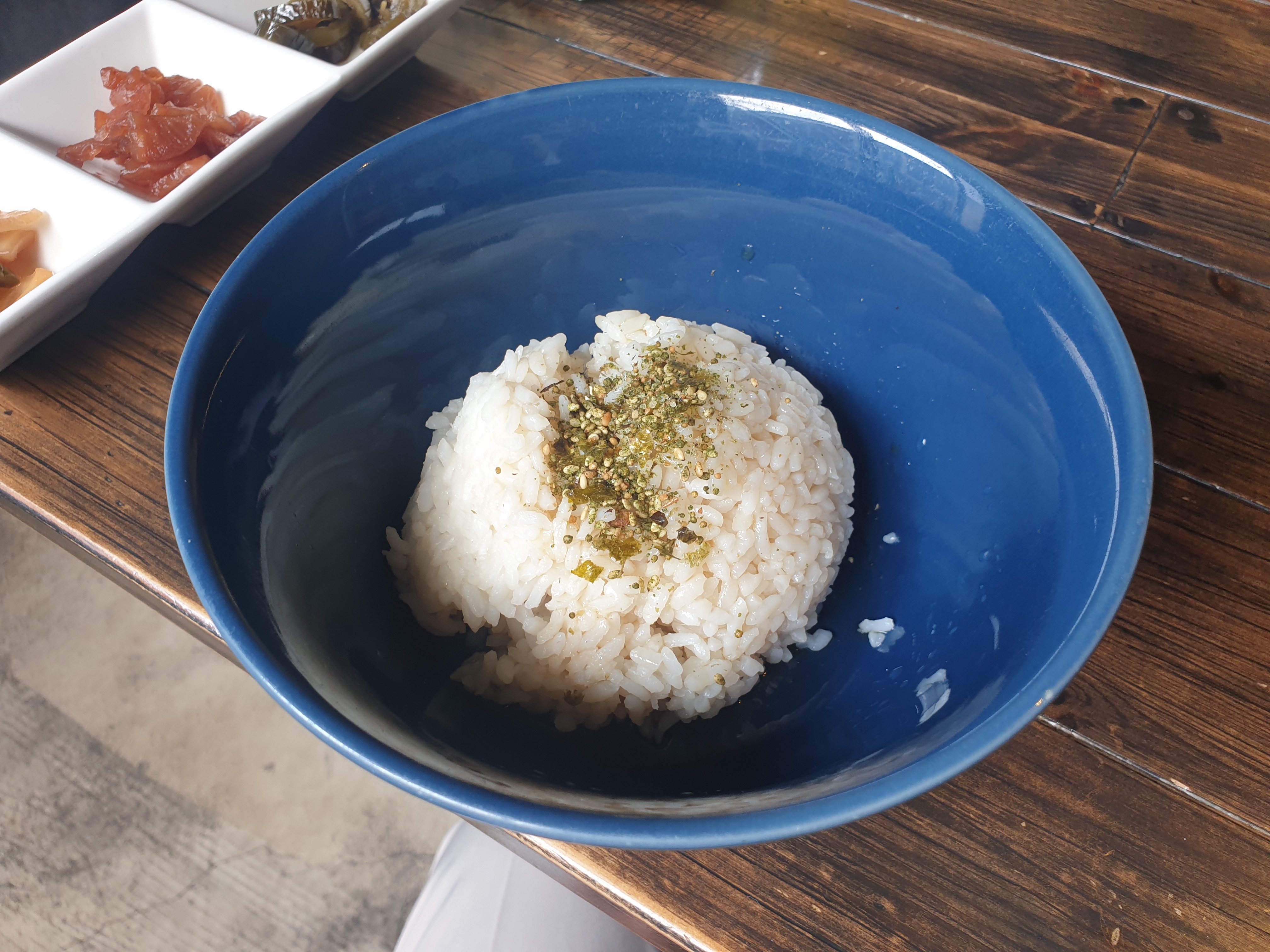 연어장이 나오기 전 참기름으로 간이 된 밥입니다! 밥만 먹어도 맛 있었습니다.