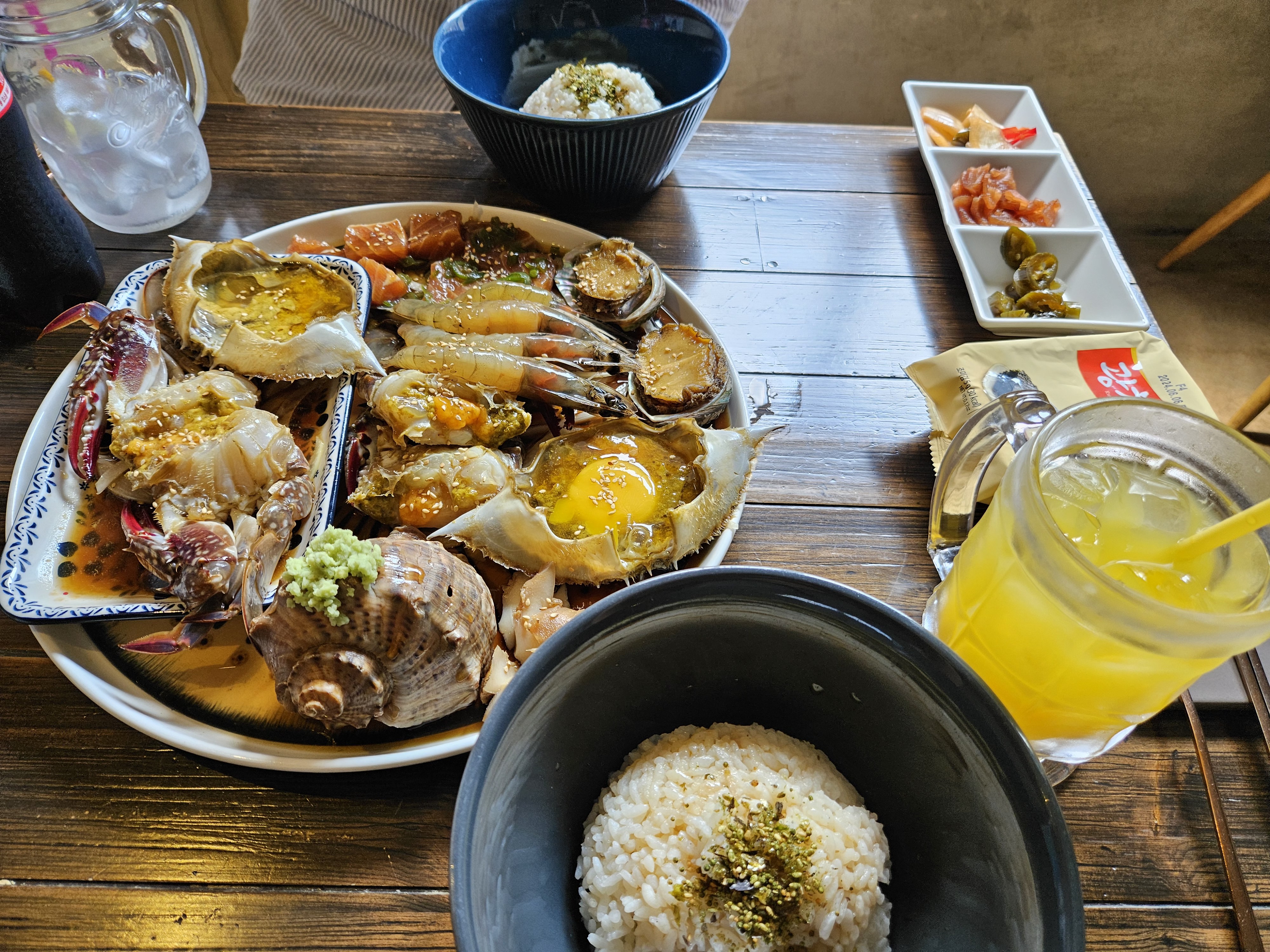 이어서 나온 째리장입니다. 메뉴판 소개를 들어보면 "게장, 연어장, 새우장, 전복장, 소라장 + 간단 3종 반찬, 조미김, 밥 2인분 (기본 째리장에는 채썬육회 미포함) 째리의 비법 간장으로 숙성시킨 째리식 '장'"라고 합니다. 연어장집에 걸맞게 짭잘한게 먹는 순간 밥도둑의 스멜이었습니다. 츄류륩.