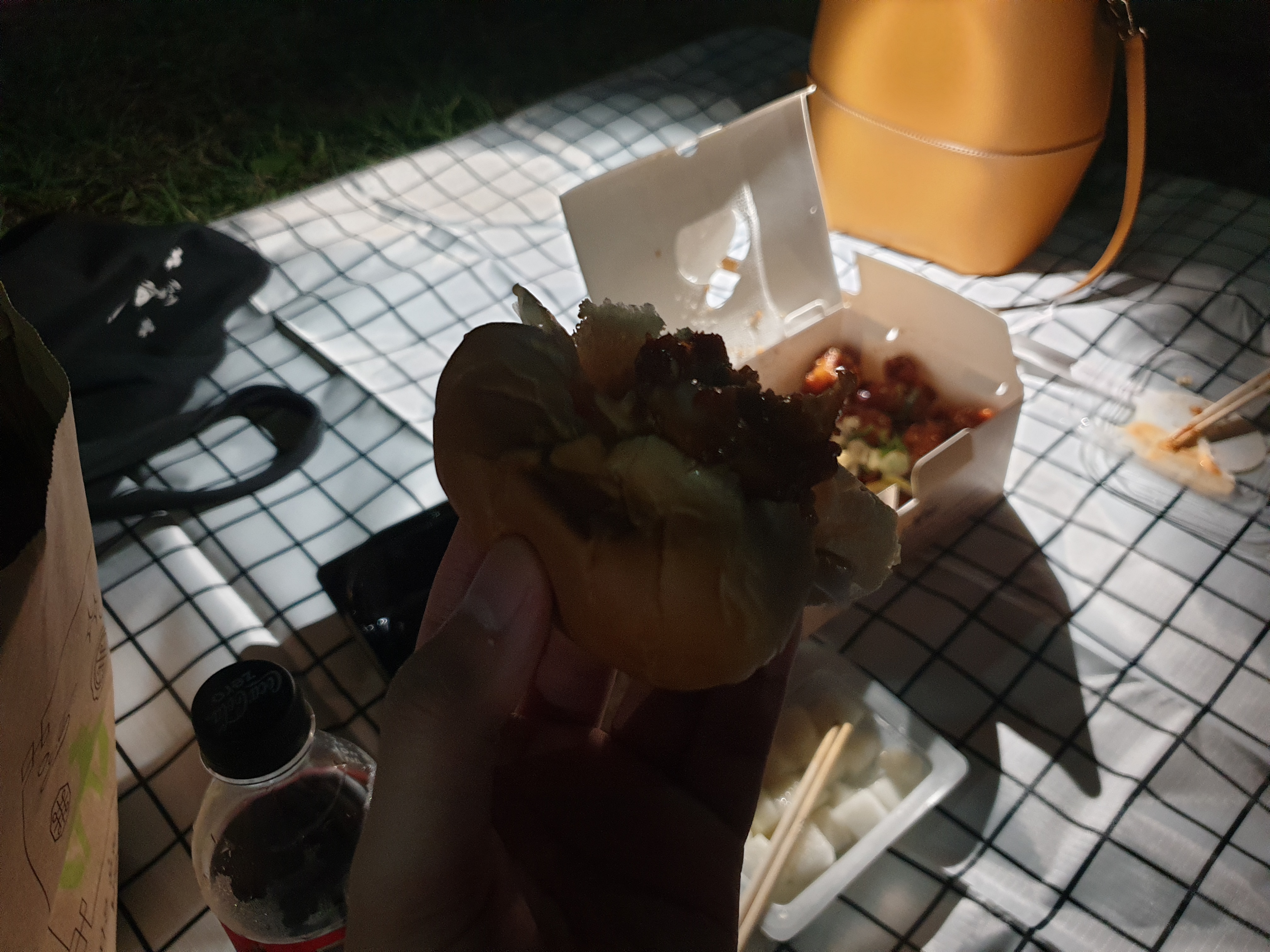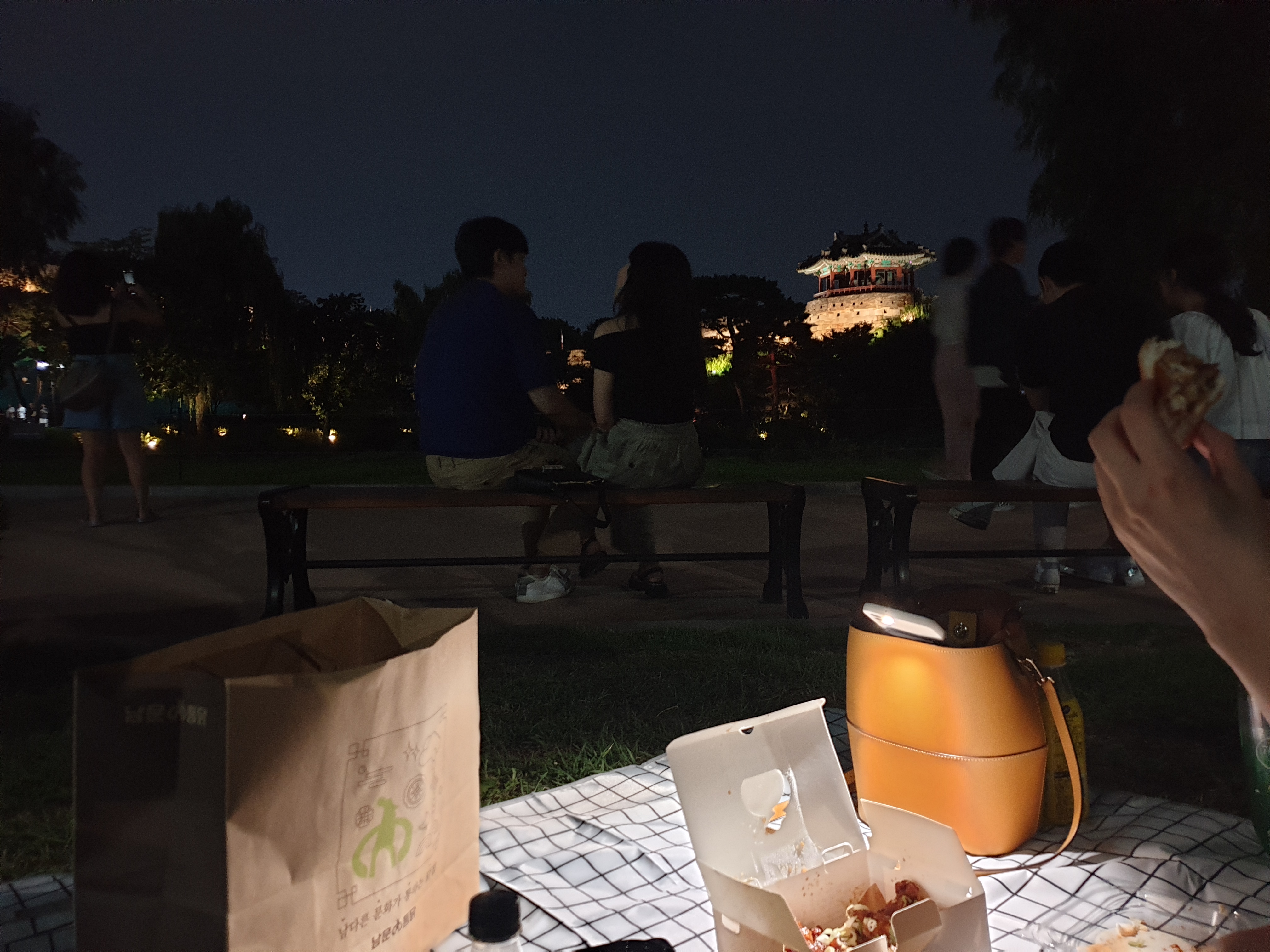 이어서 통닭거리에서 수원천을 따라서 쭈욱 걸어가면 나오는 방화수류정에서 돗자리를 펴고 통닭을 먹었어요. ㅎㅎ