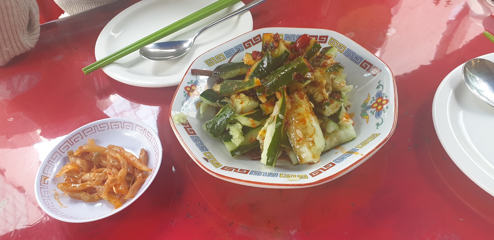 오이무침이 가장 먼저 나와서 오이무침을 바로 시식했습니다. 중국식 오이소박인 것 같았습니다. 우리나라 오이소박이보다 신 맛이 강했지만 맛 있었습니다.