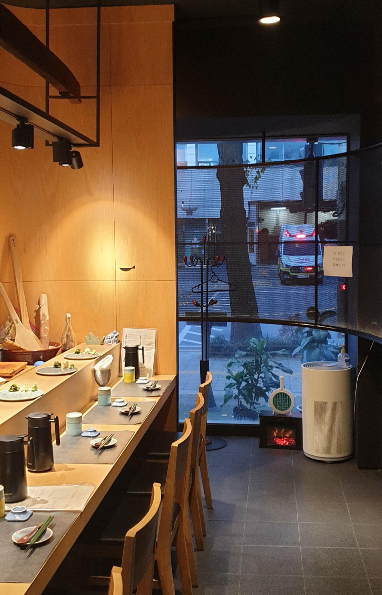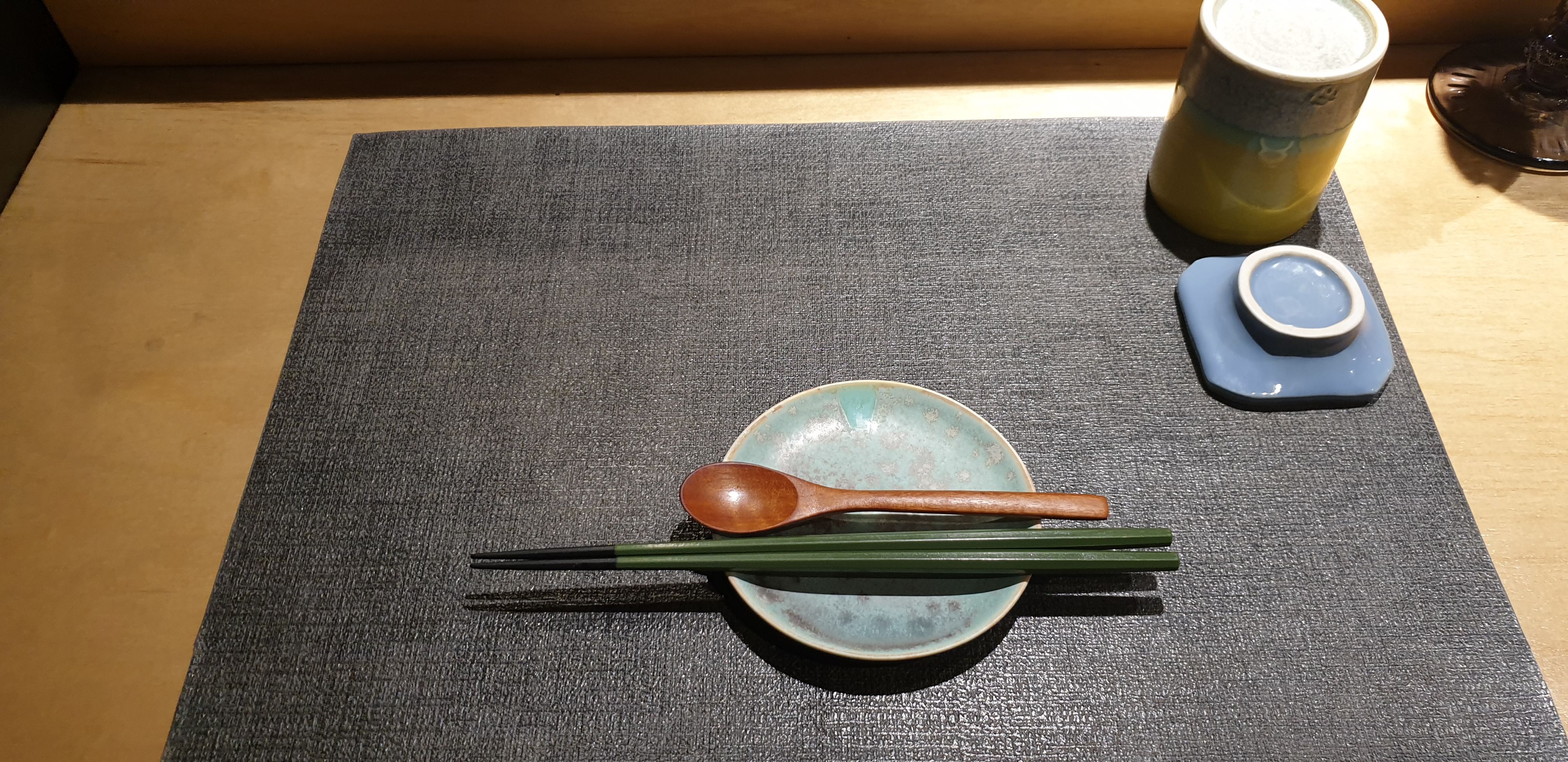 오마카세 먹기 전 물로 입 안을 헹구고 경건하게 기다렸습니다. 오마카세는 처음이라 긴장긴장됐습니다.