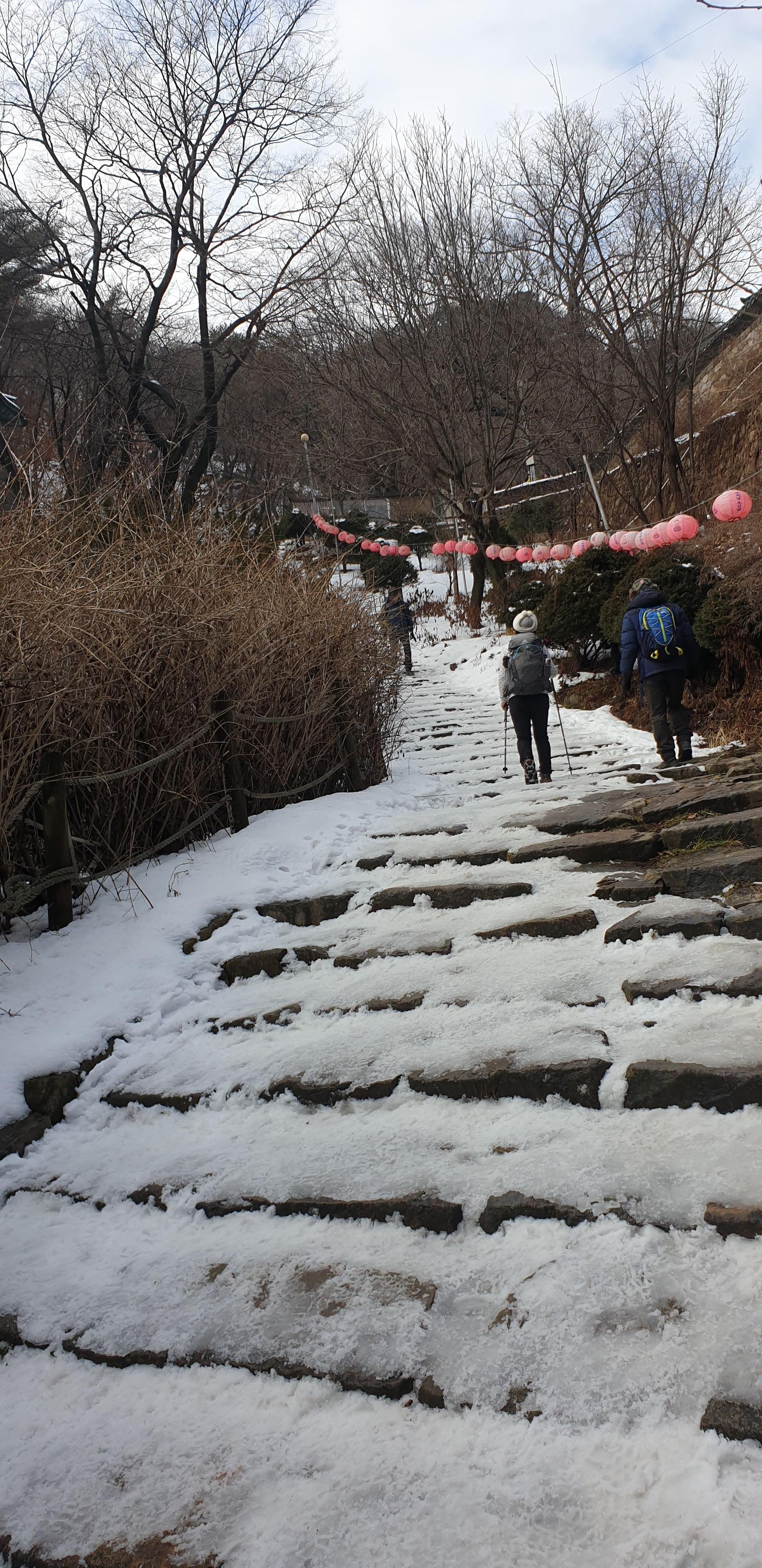 산 초입에는 눈이 없었지만 산을 오르다보니 눈이 쌓여있는 구간이 있었습니다. 만약에 아이젠을 끼지 않았다면 중간에 포기했었을 것 같습니다.