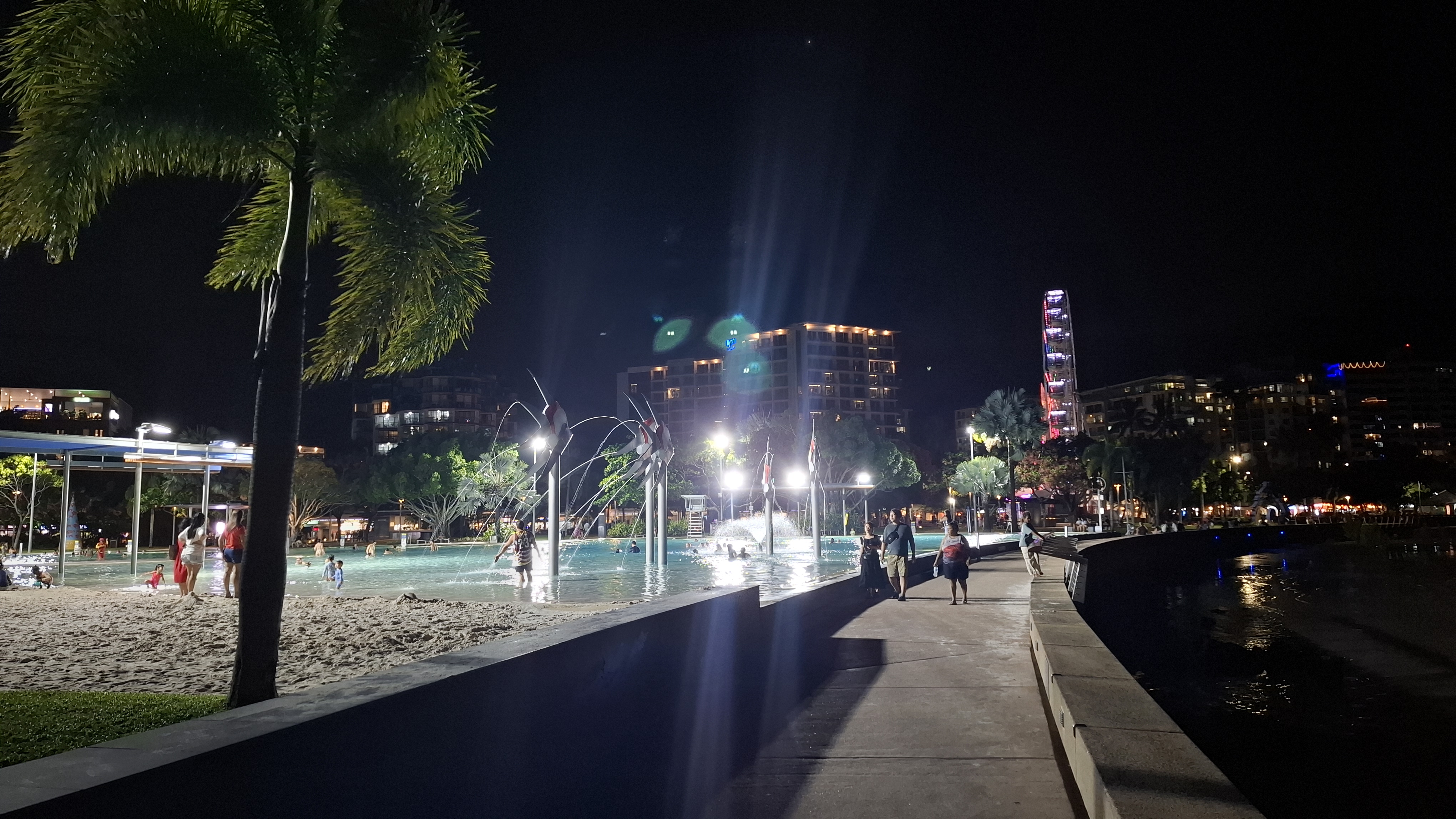 에스플러네이드 라군은 밤 9시까지 무료 수영 가능해서, 늦은 시간에도 수영하는 사람들이 많았어요.