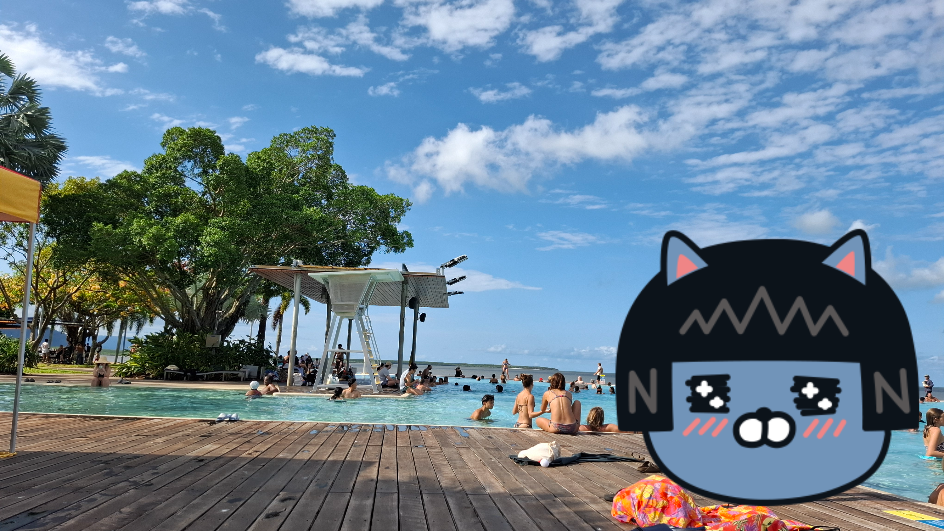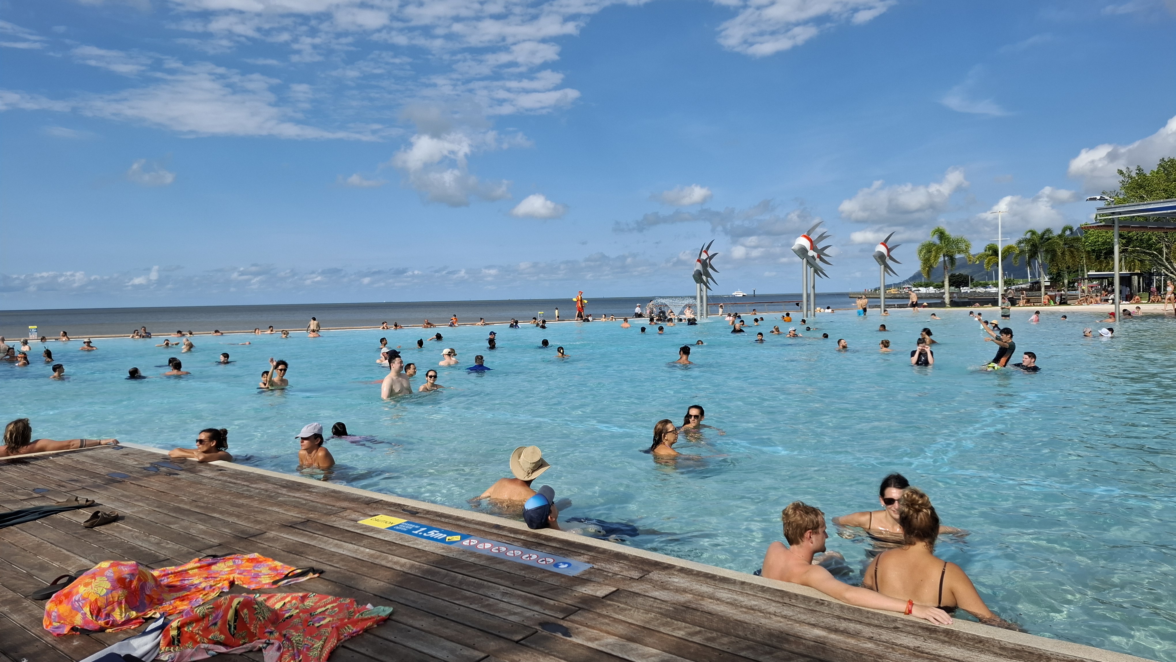 점심 후 잠시 쉬고 Crystalbrook Flynn 호텔의 수영장을 이용해 보았어요. 호텔 1층과 2층에 수영장이 있는데, 1층은 바(Bar)와 연결되어 있어서 다소 부담스러웠고, 2층 수영장을 이용했어요. 하지만 그늘진 곳이라 물이 너무 차가워서 오래 있기는 어려웠습니다. 결국, 에스플러네이드 라군으로 이동했습니다.
