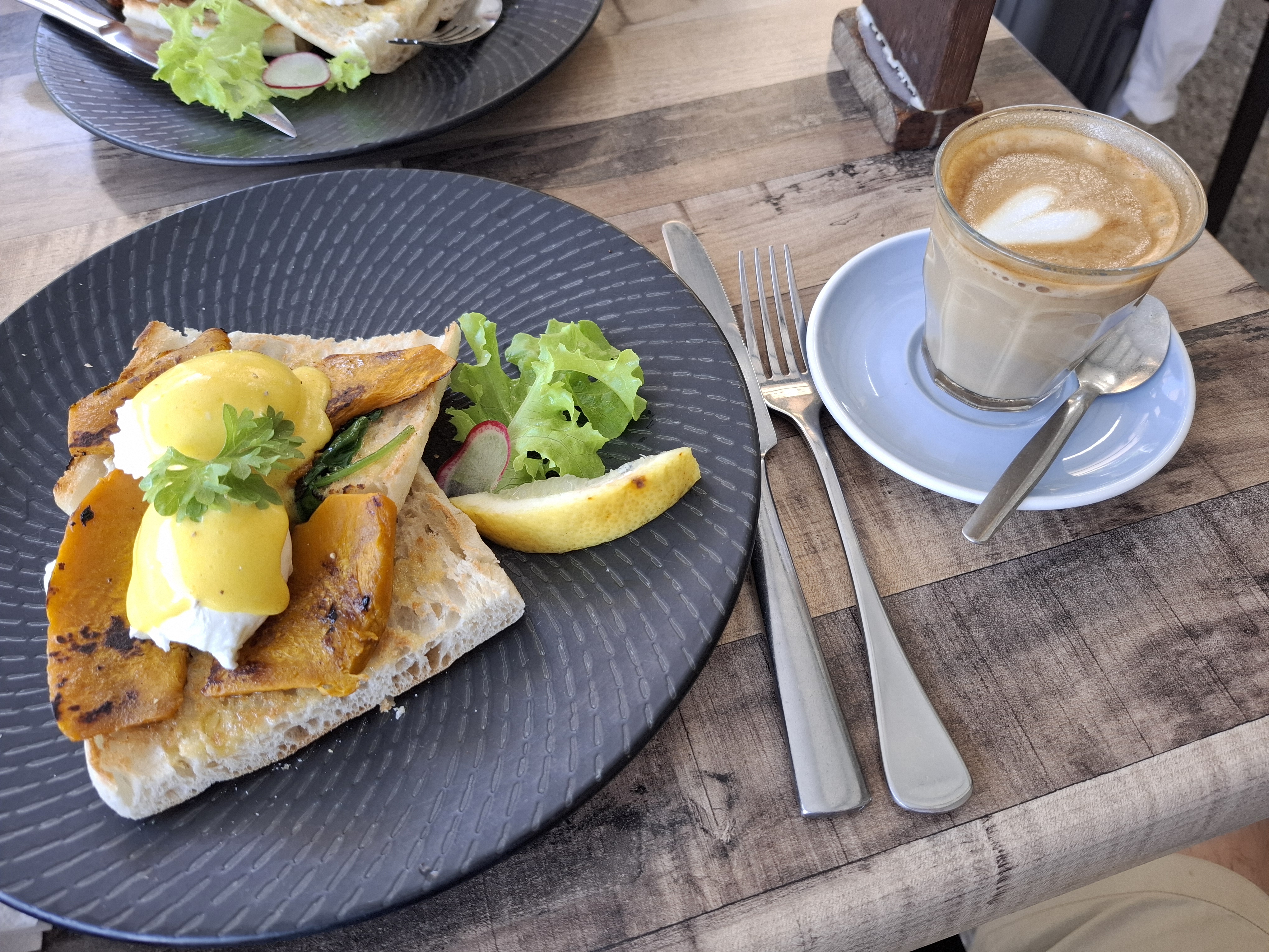 평소 같았으면 이런 더운 날씨에 따뜻한 커피는 절대 마시지 않겠지만, 주변을 보니 대부분의 사람들이 따뜻한 커피를 마시고 있더라고요. 그래서 저도 따뜻한 라떼를 주문했고, 와이프는 롱 블랙 아이스를 선택했어요. 그리고 저는 Egg Benedict / Roast Pumpkin(에그 베네딕트와 구운 호박), 와이프는 Garden Breakfast를 주문했습니다.