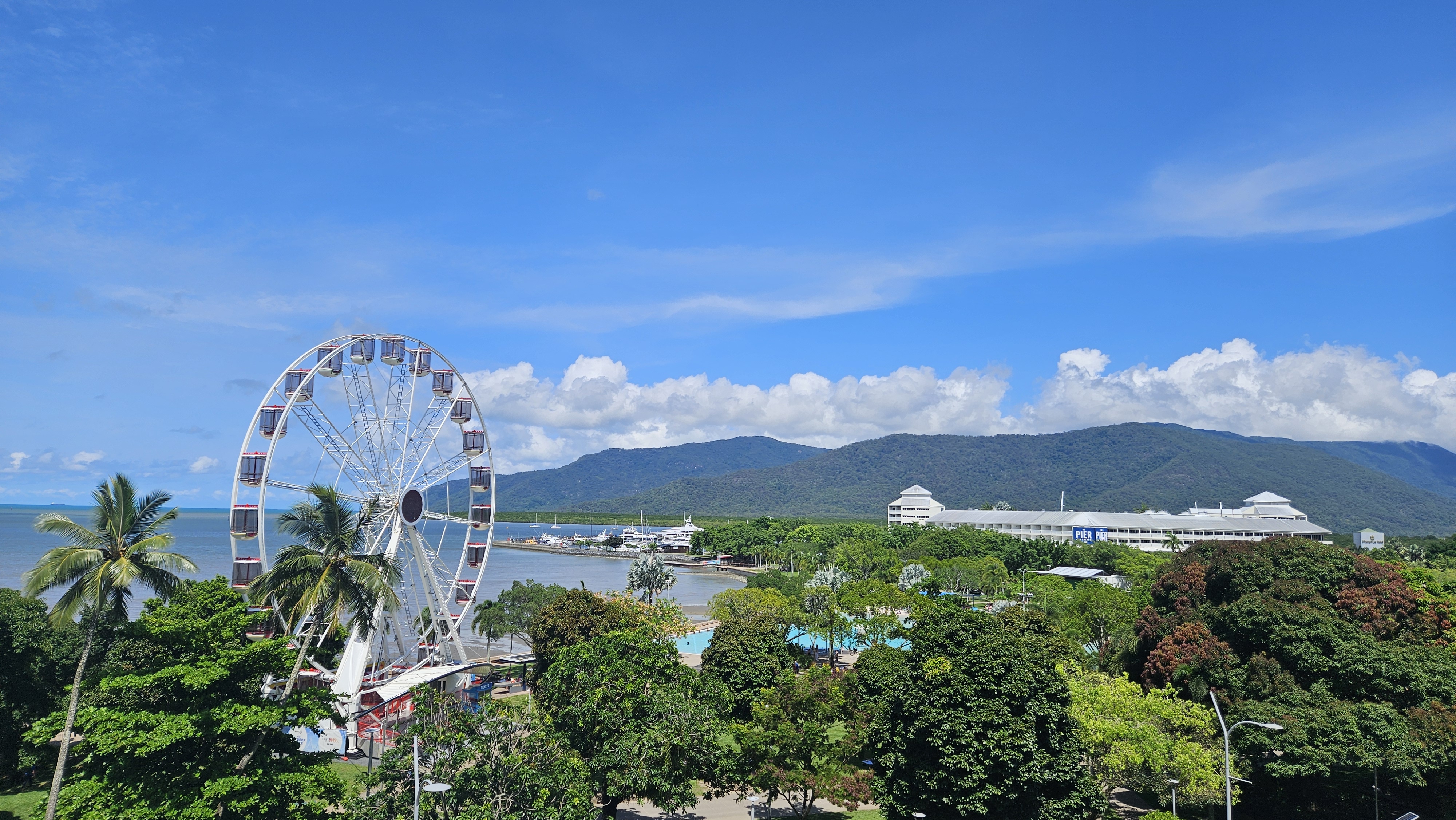 3일차에도 다시 한번 느낀 점은, 숙소 선택이 탁월했다는 것! 아침에 눈을 뜨면 케언스의 관람차와 산 뒤로 보이는 구름이 어우러진 멋진 풍경이 펼쳐졌어요. 이런 경치를 보며 하루를 시작하는 것은 정말 최고의 경험이었습니다. 😊