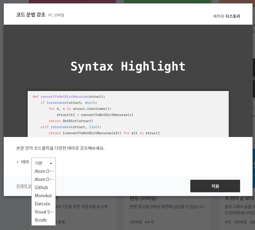 티스토리의 코드블럭에 플러그인에서 제공하는 코드 문법 강조를 적용하면 기본 포함 8개의 템플릿만 제공합니다